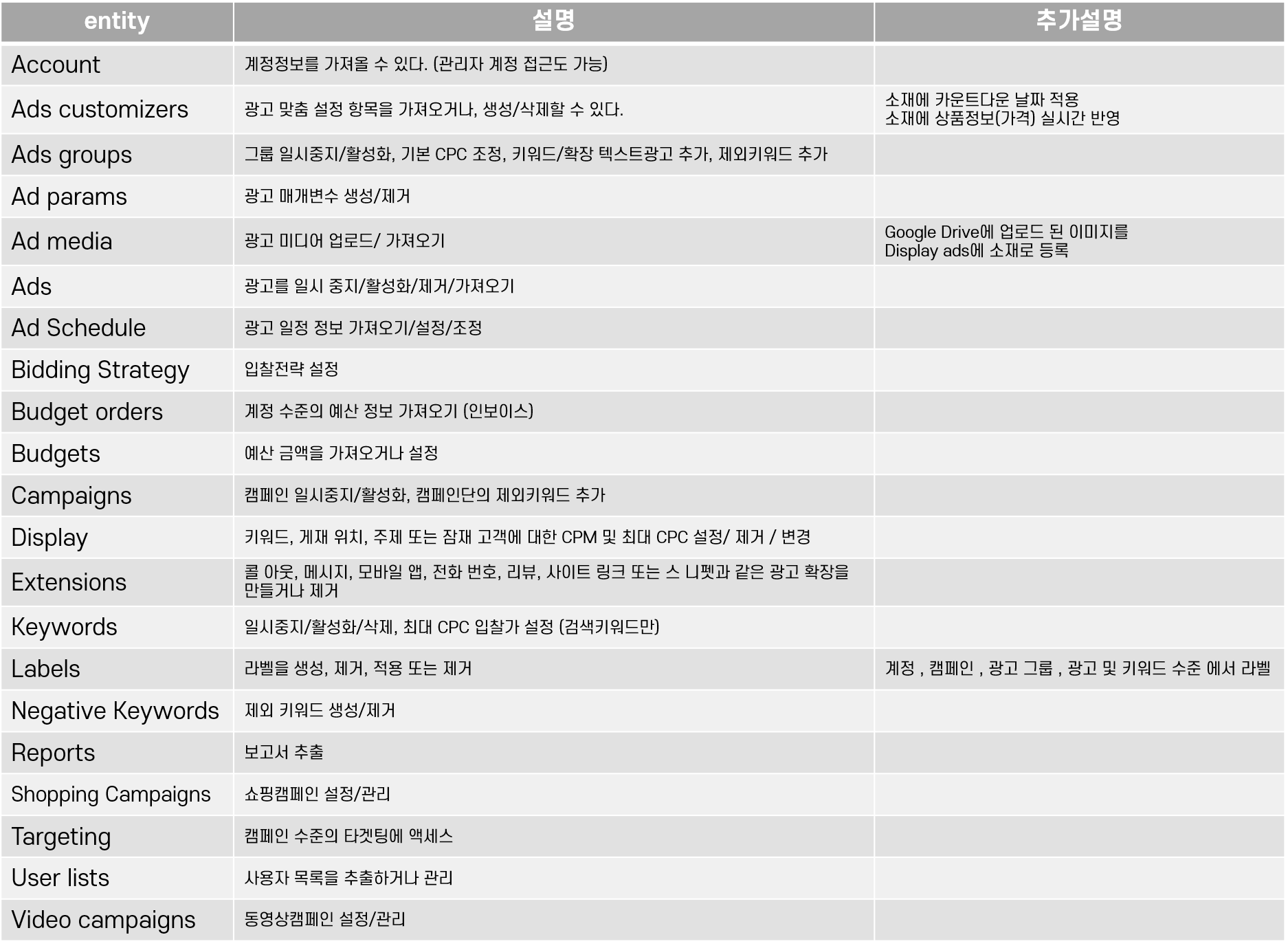 Entity는 객체, 즉 우리가 Ads Script로 조작할 수 있는 요소들이 무엇인지 어떤 일들을 할 수 있는지가 설명 되어있습니다. 계정/캠페인/그룹의 세팅 내용에 접근하여 수정하거나 생성/제거하는 것들을 할 수 있고 소재 등록이나 보고서 추출까지 할 수 있는 것을 확인해볼 수 있습니다.